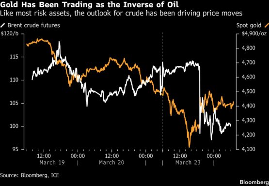 Bullion fell as much as 2.3% in another volatile session marked by the metal’s inverse relationship with oil. President Donald Trump’s postponement of US attacks on Iran’s power network offered brief respite from gold’s dramatic wartime decline, before an Iranian official ruled out talks and the Wall Street Journal reported that US partners in the Persian Gulf could join the fight.